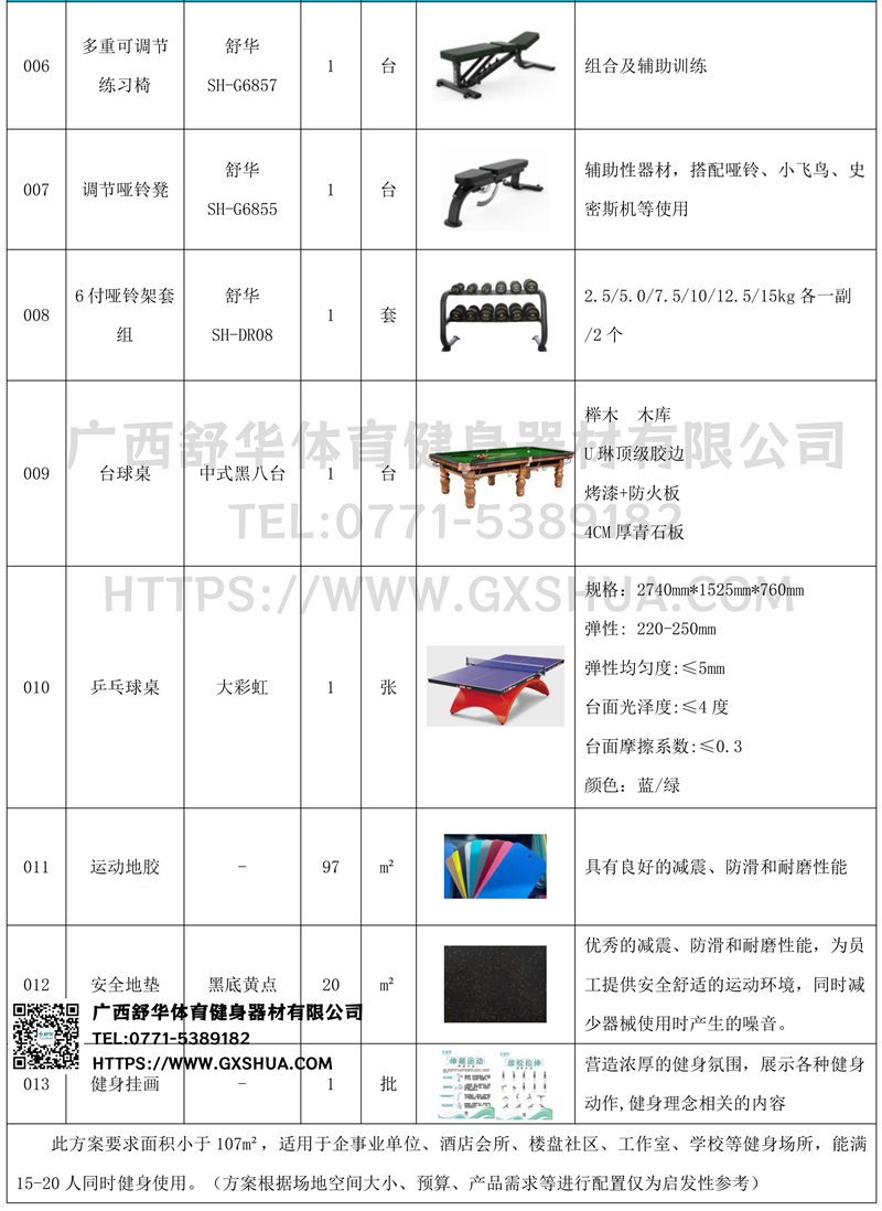 此方案要求面积小于107m²,适用于企事业单位、酒店会所、楼盘社区、工作室、学校等健身场所,能满15-20人同时健身使用。(方案根据场地空间大小、预算、产品需求等进行配置仅为启发性参考)
