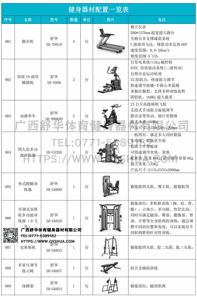 蹬腿训练器(1台)、小飞鸟(1台)、史密斯机1台)、深蹲训练器(1台)、多重可调节练习椅1台)、腹肌板(2台)、10付哑铃套组(1套)、哑铃凳(1台)、杠铃片架(1台)、可以实现对不同肌肉群的针对性训练,满足肌肉训练需求,全方位激活身体机能。